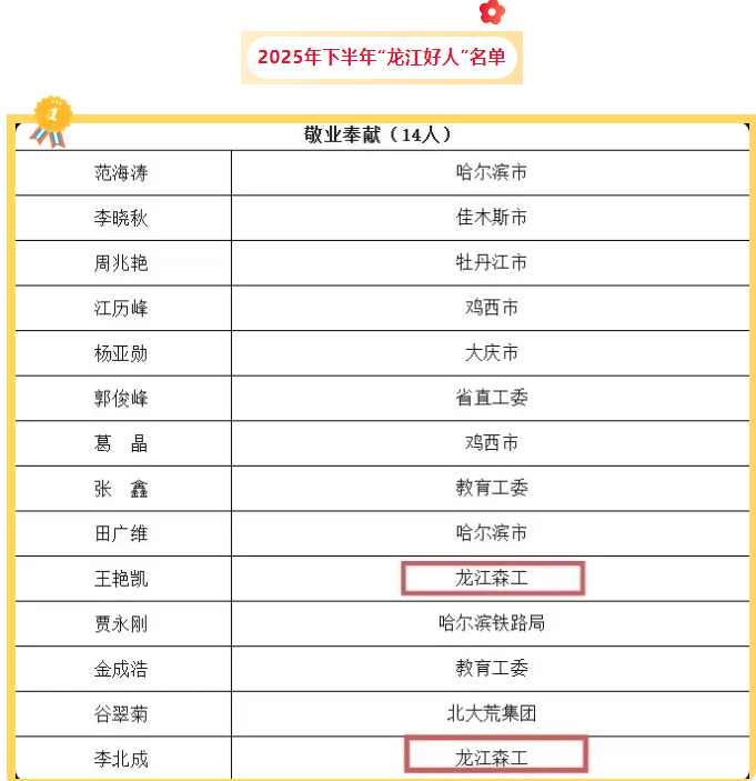 日前,黑龙江省文明办公布2025年下半年“龙江好人榜”,龙江森工集团李北成和王艳凯入选敬业奉献类“龙江好人”。