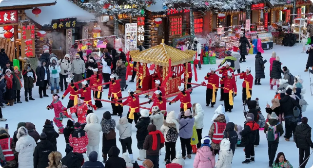 ![]() 今年的雪乡故里,将民俗喜庆氛围推向了新高潮。安塞腰鼓、东北大秧歌与二十四节令鼓的快闪表演随机上演,鼓点与欢笑声交织,为冰雪秘境增添喜庆氛围。而全新推出的 NPC 体验式抢亲节目,成为文旅体验的亮点,活动融合达斡尔族迎亲习俗与现代婚庆互动玩法,游客可化身伴郎伴娘出谋划策,或作为围观乡亲加油喝彩,在趣味关卡与红包祝福中深度感受东北婚嫁文化的热闹与温情。 “来到雪乡故里,看到了安塞腰鼓和东北扭大秧歌,非常好看,也感受到了东北最原汁原味儿的过年气息,感觉特别棒。”沈阳游客董微开心地说。 河北游客未来则对抢亲互动活动赞不绝口:“抢亲活动感觉太有意思了,就从来没见过这种场面,真的感觉很棒,很开心,来到雪乡故里这次真的太值得了。”