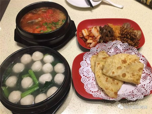 菠菜丸子砂锅,现做现卖,等候几分钟端上来的套餐,配了一张油饼+两个小咸菜。接近冻成冰人的记者,一勺热汤下肚,暖心暖胃。砂锅汤的味道清淡不腻,辣白菜等小菜都很正宗。