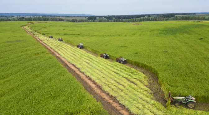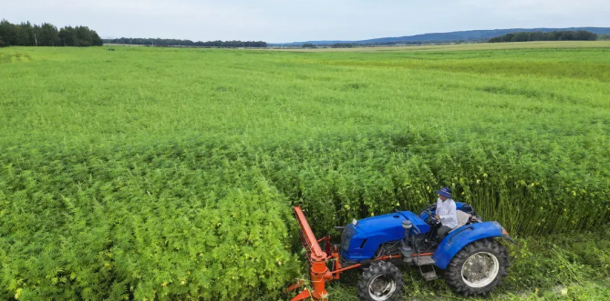 为深入实施“一场一品”“一局一业”战略,推动现代化生态产业体系建设上新台阶,集团党委着眼战略性新兴产业和未来产业,提出加快实施“九个一”(一粒籽、一株树、一根葱、一只鹅、一株药、一棵参、一株麻、一箱蜂、一棚果)产业项目重点突破工程。 “龙江森工”微信公众号将陆续推出稿件,关注“九个一”产业发展动态,展示最新发展成果。 “国纺源头,万年衣祖”,这是人们对汉麻的美誉。据史书记载,汉麻起源于中国,又名大麻、线麻、寒麻、火麻等,是人类最早使用的纺织纤维原料之一。 近年来,龙江森工集团把发展壮大汉麻产业作为“九个一”重点产业项目突破工程加以推进,全力以赴将“一株麻”产业打造成企业增效、职工增收的金色产业。 位于小兴安岭西南麓的绥棱林区,日照时间长、昼夜温差大、夏季雨量充沛,具有种植汉麻的气候、温度等优势,这里也因此成为龙江森工集团发展“一株麻”产业的首选地。 今年刚入秋,绥棱林业局有限公司种植的汉麻即迎来了收获季,在1.3万亩汉麻种植基地,郁郁葱葱的汉麻一眼望不到边,9台收割机在田里往来穿梭,收割的汉麻铺放整齐,一排排、一趟趟,场面蔚为壮观。 2024年,按照集团“一场一品”“一局一业”战略部署,绥棱局公司多次组织班子成员赴孙吴、青冈县等地考察学习先进的汉麻种植技术,因地制宜采取集约化经营和分散式种植相结合的方式,将汉麻种植面积由6000多亩扩大到 1.3万亩。 五道河林场是以分散式种植汉麻为主的林场,在原来种植大豆的地块上,新种植了3456亩工业汉麻,看着被收割下来的汉麻齐刷刷排列在地上,职工们的喜悦之情溢于言表。 “我们绥棱林区气候条件独特,非常适合汉麻日晒夜露的成长习性,种出的汉麻分裂度和麻束断裂比强度高、麻束纤维强力高、纤维素含量高,木制素含量低。”五道河林场副场长丁宝昌告诉记者,公司收购汉麻价格每亩要比传统种植大豆的收益多200元。