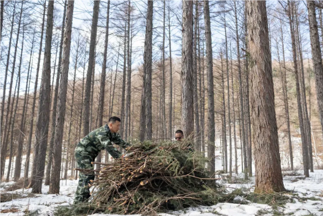 3月14日,在伊春森工集团美溪林业局公司一处森林可持续经营试点样地,工作人员在整理林下剩余物。新华社记者 谢剑飞 摄
