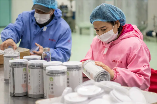 3月12日,在伊春桦肽生物药业有限公司,工作人员在包装桦树汁相关产品。新华社记者 谢剑飞 摄